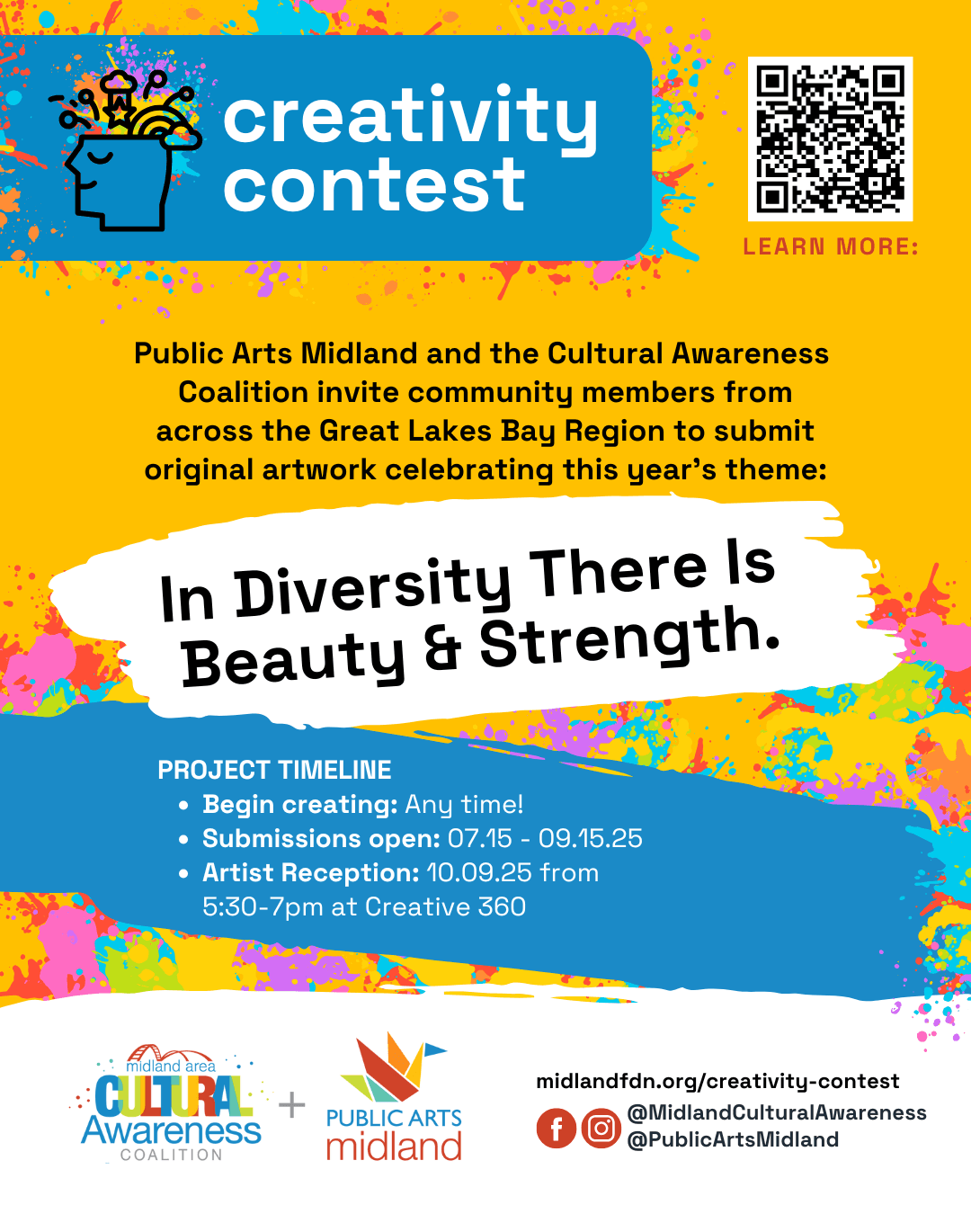Public Arts Midland and the Cultural Awareness Coalition invite community members from across the Great Lakes Bay Region to submit original artwork celebrating this year’s theme: “In Diversity There Is Beauty and Strength.”